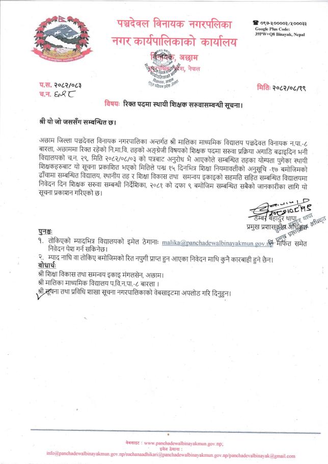रिक्त पदमा स्थायी शिक्षक सरुवा सम्बन्धी सूचना !