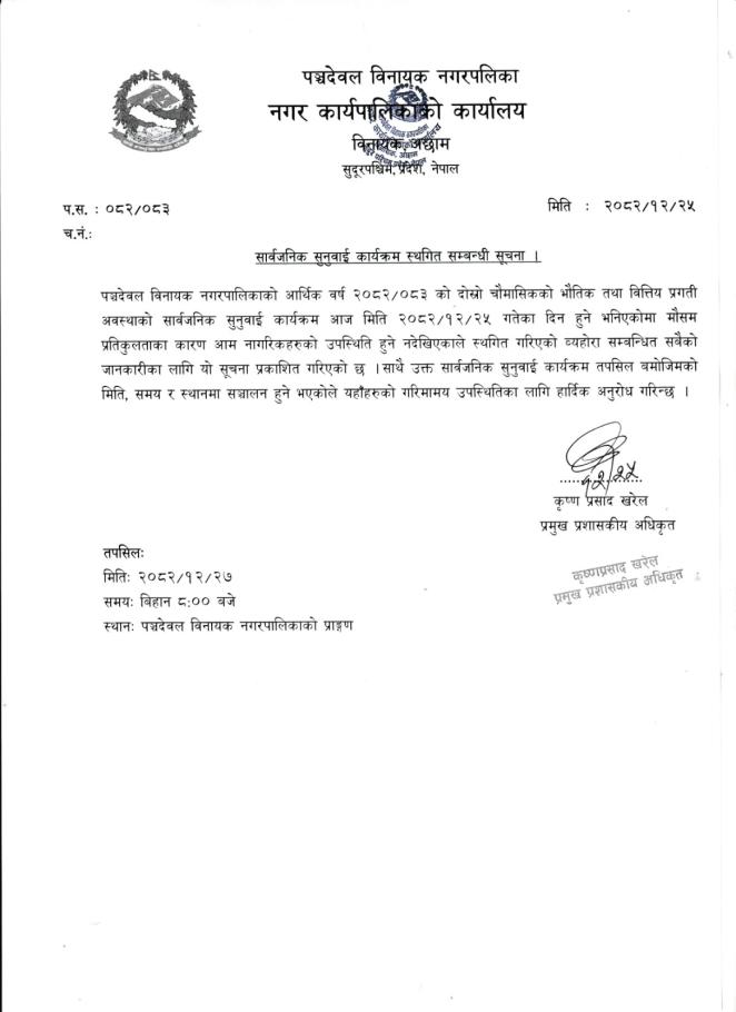 सार्वजनिक सुनुवाइ कार्यक्रम स्थगित सम्बन्धी सूचना !